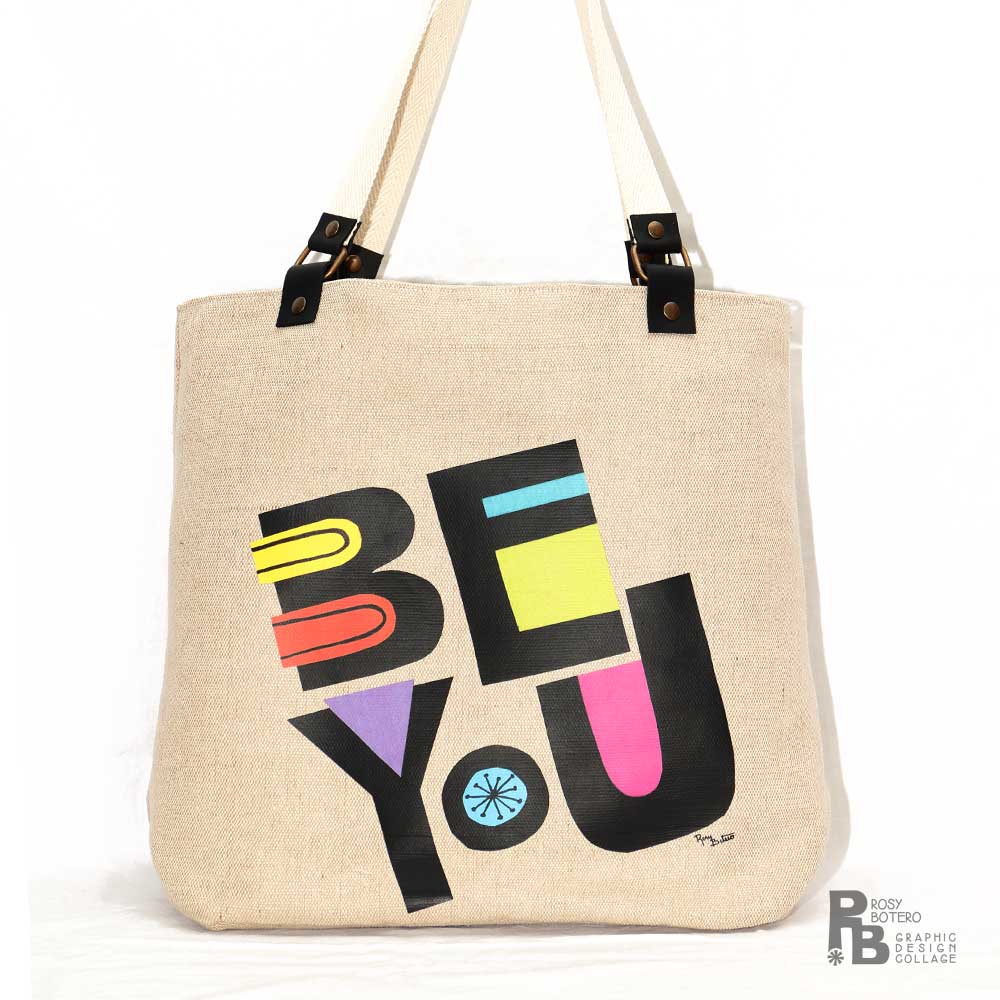 Este bolso lleno de color y estampado con un collage con palabras llenas de positivismo y empoderamiento es una pieza original, hecha a mano que le dará a tu vida mucha luz y buen rollo.
